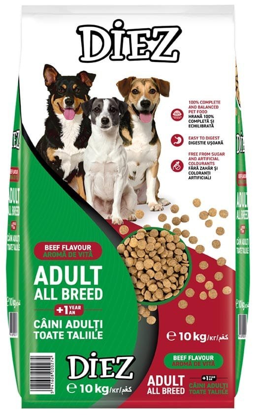 Diez karma dla psa wołowina 10 kg to wysokiej jakości sucha karma przeznaczona dla dorosłych psów wszystkich ras. Starannie dobrana receptura dostarcza niezbędnych składników odżywczych, które wspierają zdrowie, witalność oraz prawidłowe funkcjonowanie organizmu psa.